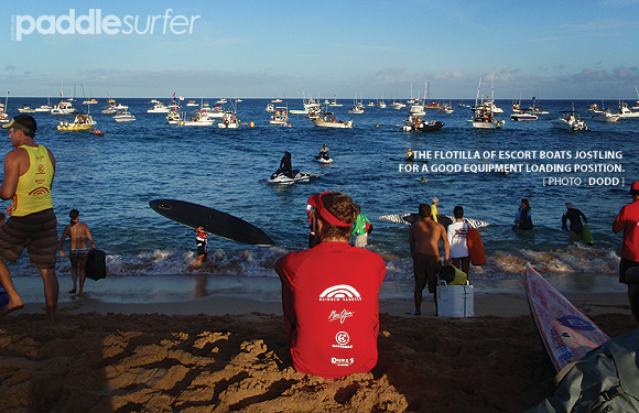 With 126 competitors came 126 support boats. The majority anchored off the beach waiting for their paddlers to load their gear. Fortunately we knew some of the Hawaiian Water Patrol who were on jetskis, so we got a lift out with them with the gear we still had to put on the boat. Mainly drinking water, cameras and electronic equipment.