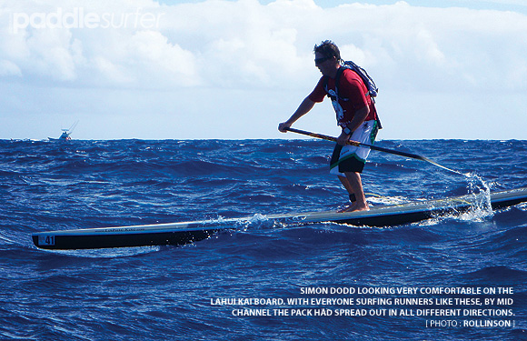 The paddleboard division started first to the sound of the race director wishing everyone a safe trip across the radio. Thirty minutes later the SUPs started. I heard the gun and we quickly got sight of Sam who was easily recognisable in all red. One thing that is recommended is that you wear bright clothing and/or hat so your escort boat, or in the unfortunate case, a rescue party, can find you. Sam was near the front in third place. The first 30 minutes seemed to take forever as I was amped to get onto the board. After what seemed like an eternity, I was in the water ready for the first changeover. By the time I got on the board the swell and wind had picked up. I said to myself, right, this is it, concentrate on surfing the runners, let the escort boat point me in the right direction and I was off. After waiting so long for my turn on the board the time actually paddling went extremely fast. These were the ultimate downwind conditions, surfing runner after runner, listening to the hoots of the boat crew, my body working overtime to keep up the ultimate speed and take advantage of every bump that came my way. This was what it was all about. Soon I spotted Sam in the distance in the water, hand in the air so I wouldn't lose sight of him in the large swell, it was time for another swap.