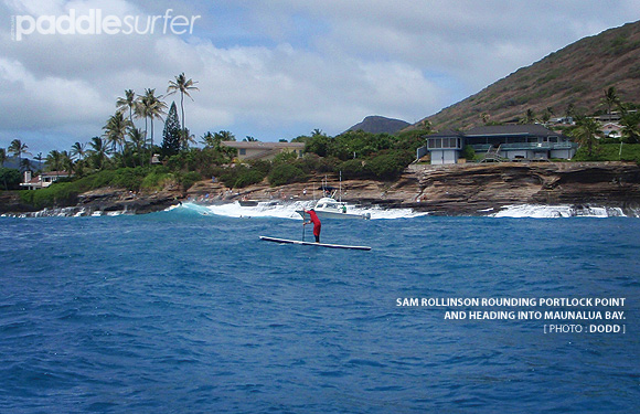 I awoke the next morning to the sight of a nice little wave at the front of my condo. The wind wasn't up yet so I raced next door to the Outrigger Canoe Club and grabbed Todd's 9'3 Sub Vector. A south swell was building and I was soon joined by Todd and a handful of other SUP riders on a fun left hander. The wind gradually built up during the day so it was time for a paddle on the raceboard. I headed east, out to Hawaii Kai where the race was to finish and decided to paddle the last few miles of the race course. I started off in the tranquil waters of the bay and was pushed out quickly by the tail wind until I hit China Wall. The tranquillity quickly turned into a large washing machine of wind and waves. I tried paddling up to Hanauma Bay for a return run but with the increasing wind and waves I made it half way up the Wall before turning back for a fast downwind run into the bay. Once you get around the headland the wind wraps back around it from the north and that tail wind soon turned the last couple of miles into a solid headwind.