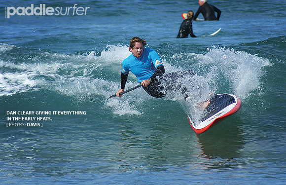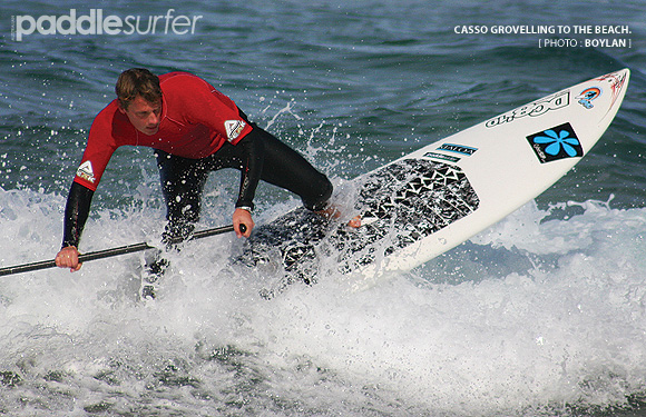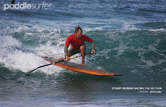 12:10pm - The air is thick with anticipation as the competitors in the open paddle race gather at the start line. Some are questioning their choice of non-handled equipment when the rules are announced and include the mandatory carrying of board and paddle during the mid course, 50m beach run. I'm happy, I have a handle, maybe that's why I made up the rule. The horn sounds and frantic activity ensues as people jostle for the best line to the buoy. A mad scramble for the prime drafting zone behind Sam P is evident. Stuey gets there first. The first turn sees Sam P board lengths ahead of everybody else - how does he do that? He even managed to shake Stuey from his tail. Chipped paddles and dinged rails result from the tight knit mid-field group. The well-being of a $500 paddle is irrelevant when so much is at stake. I think I was the main culprit. Sam P cruises over the line in first - of course.