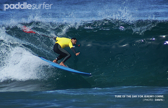 1:10pm - Rash shirts are distributed to anybody willing to have a shot at big prizes on offer in the freestyle expression session. We pull it back from the scheduled one hour to just 30 minutes as everyone is sore and/or tired. The crowd has thinned out and the tide is low. There are plenty of waves to go around with nearly 20 SUPs spread over two distinct breaks. Some are thumping on the shallow bank - it's going to be a hotly contested wipeout award.