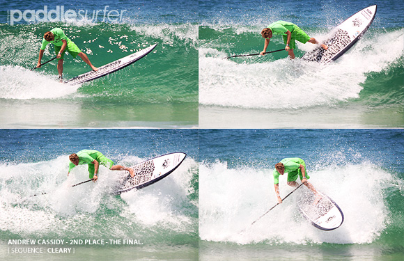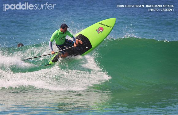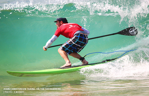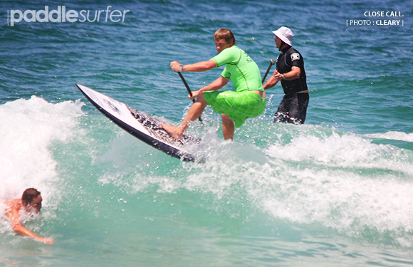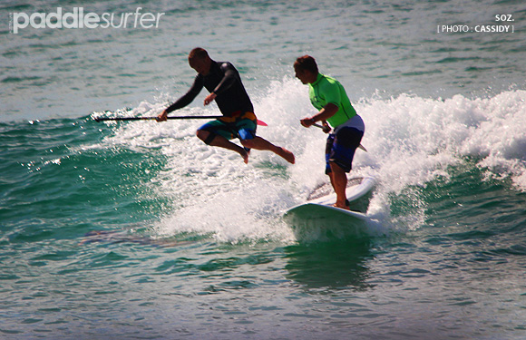 Come comp morning, the conditions were almost perfect although a couple of extra feet of swell would have been nice. The hyped Newy crew welcomed the guys from SPSC and SUP Central. A decision was made to run the 35-man/women contest in 20-minute heats. With the draw quickly established, the first heat was in the water for an 8:00am start. The SUPers made the most of the conditions that were at the mercy of the incoming tide. However, passers by and competition spectators were shown a solid and exciting exhibition by those who were in the water.