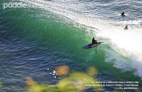 To be a model SUPer at these kinds of small take-off zone pointbreaks, we must wait our turn. Waiting our turn means queuing for the waves. Queuing for the waves means standing very close to the others as we shuffle towards the take-off zone. That's all OK if you can find enough water to dip your paddle into to maintain your balance through the chop, surges, boils and backwash. If you can't find enough water, somebody's probably going to have a ding from a paddle on the deck of their shortboard or possibly a fallen paddle surfer lying on their back. That's not cool.